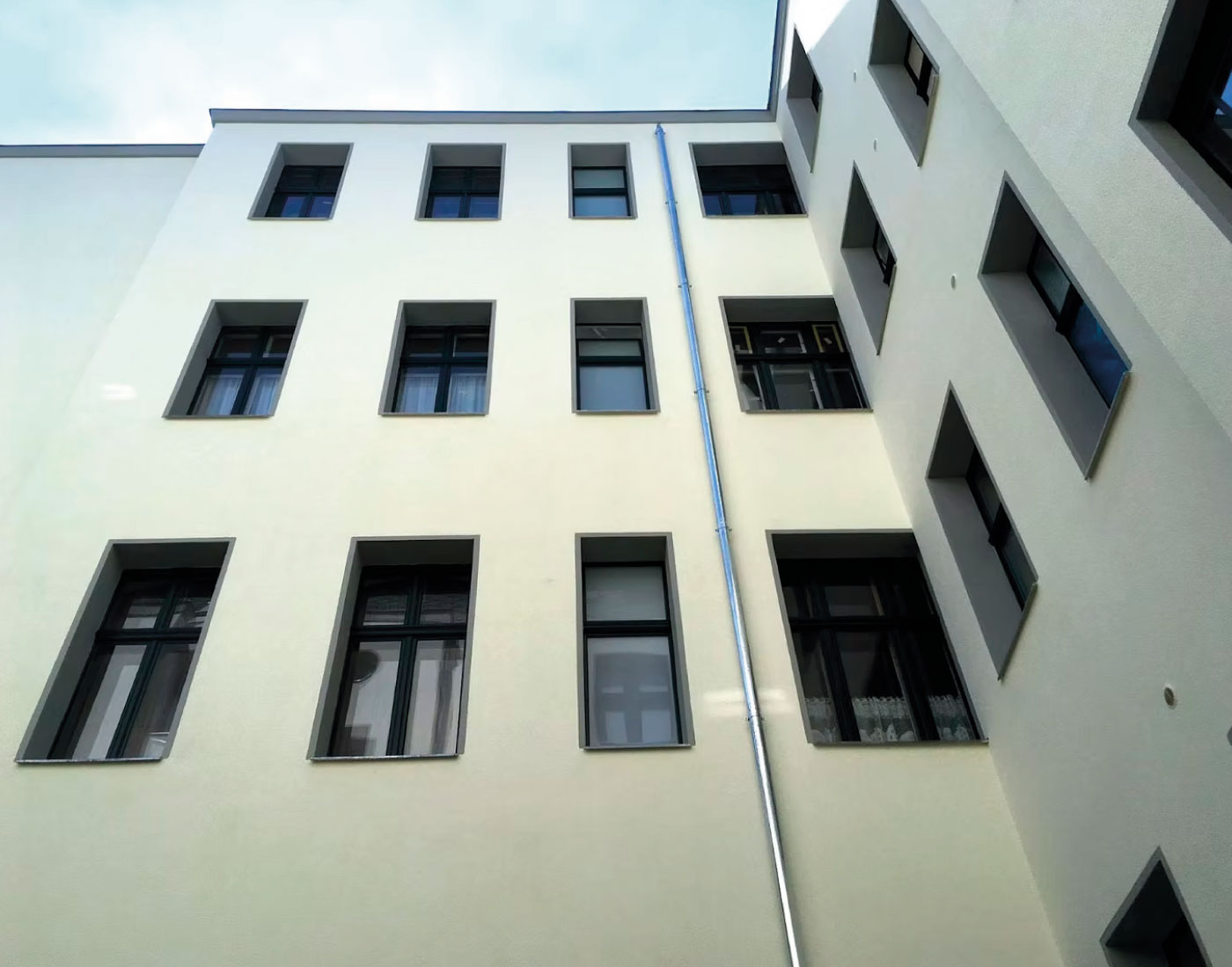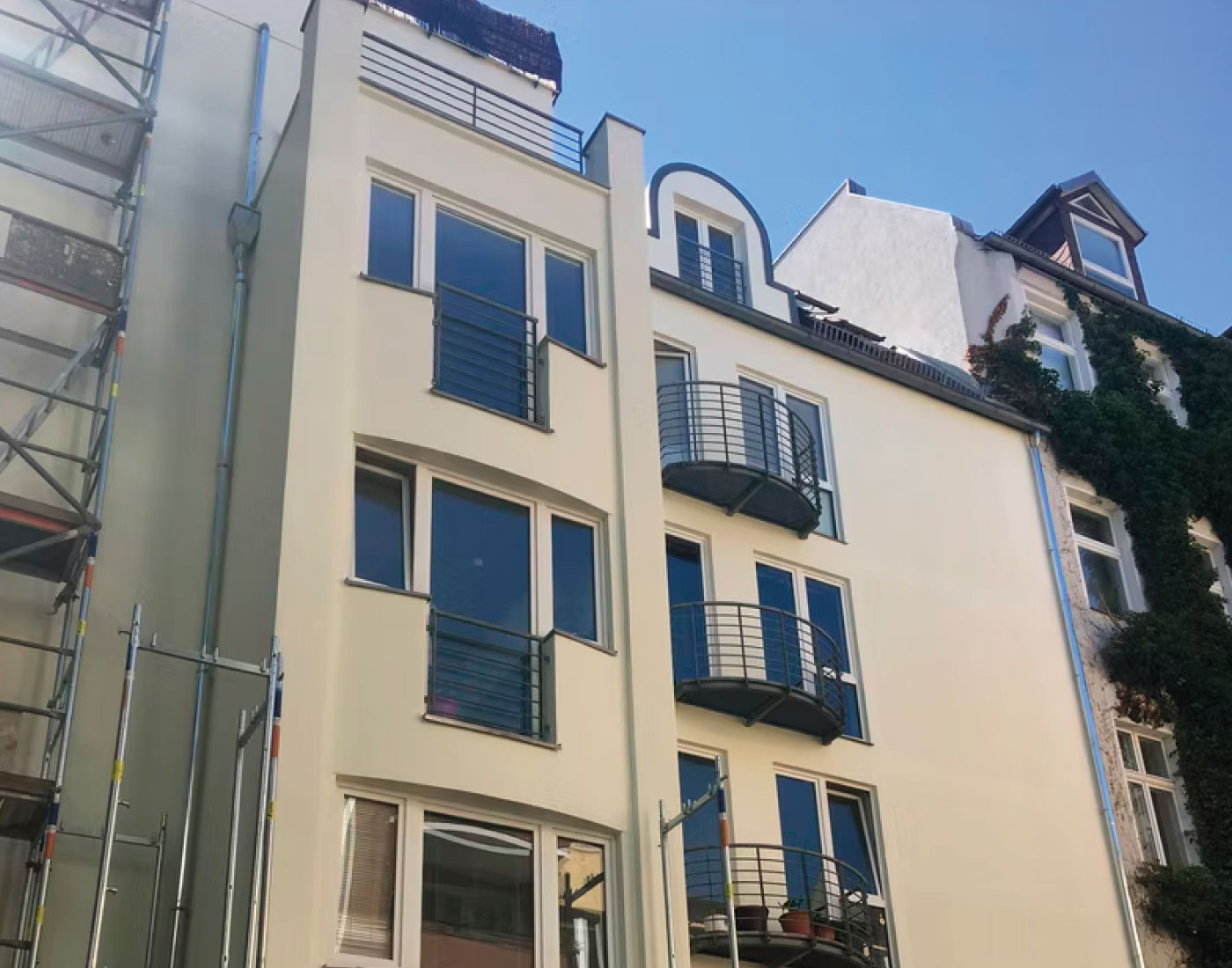 Nach Abschluss der Arbeiten präsentiert sich die Fassade modern, strukturiert und dauerhaft geschützt. Das Gebäude wirkt wieder gepflegt und fügt sich harmonisch in das Straßenbild ein.
