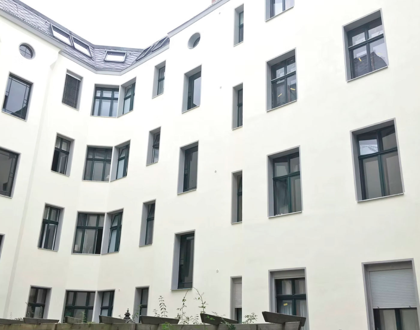 Die Fassade der Dickhardtstraße 48 wurde umfassend saniert, um das Gebäude optisch zu beruhigen und technisch zu stärken. Nach der Reinigung und Ausbesserung der Oberflächen entstand ein gleichmäßiges, modernes Fassadenbild, das die klare Linienführung betont und dem Objekt langfristige Stabilität sowie ein gepflegtes Erscheinungsbild verleiht.