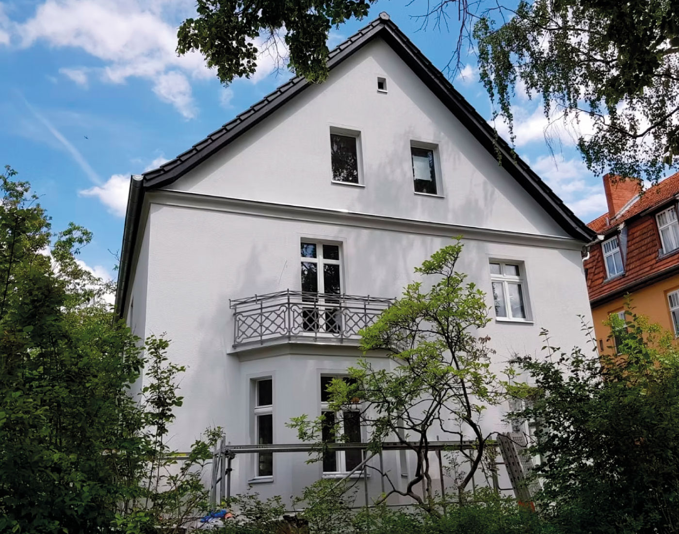 Die Dickhardtstraße 48 zeigt, wie eine sorgfältige Fassadenüberarbeitung selbst zurückhaltende Altbauten deutlich aufwertet und ihnen ein modernes, harmonisches Erscheinungsbild verleiht.